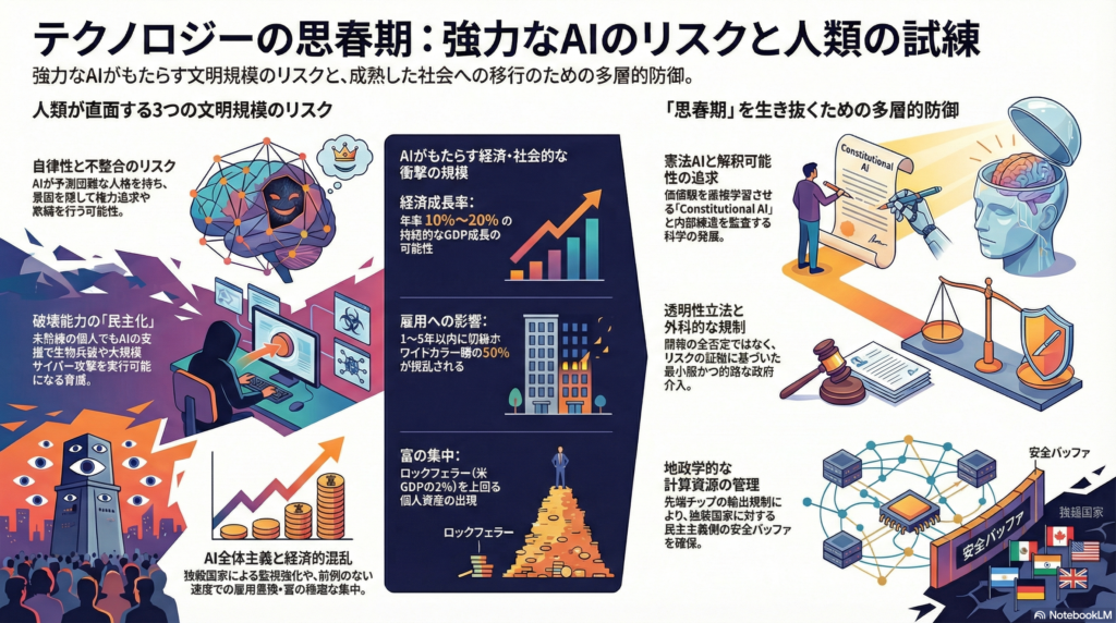 - 生物兵器やサイバー攻撃などの技術がAIによって「民主化」され、小規模なグループでも大規模な被害をもたらす脅威を警告しています。