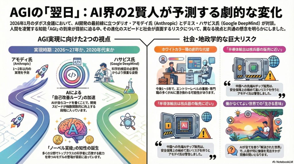 2026年1月に開催された世界経済フォーラム(ダボス会議)にて、Anthropicのダリオ・アモデイCEOとGoogle DeepMindのデミス・ハサビスCEOは、AIの進化がもたらす「技術的思春期」とそのリスク、そして科学的進歩への期待について対談しました。