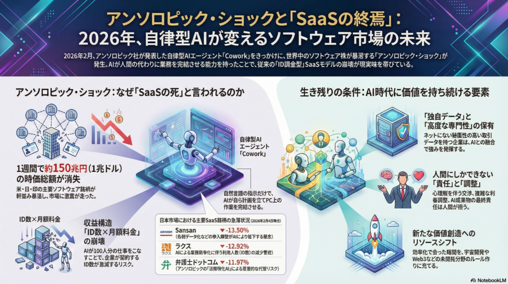この現象は、AIが従来のSaaS(ソフトウェア・アズ・ア・サービス)を根底から破壊するという恐怖から「SaaSpocalypse(サースポカリプス:SaaSの黙示録)」とも呼ばれています。